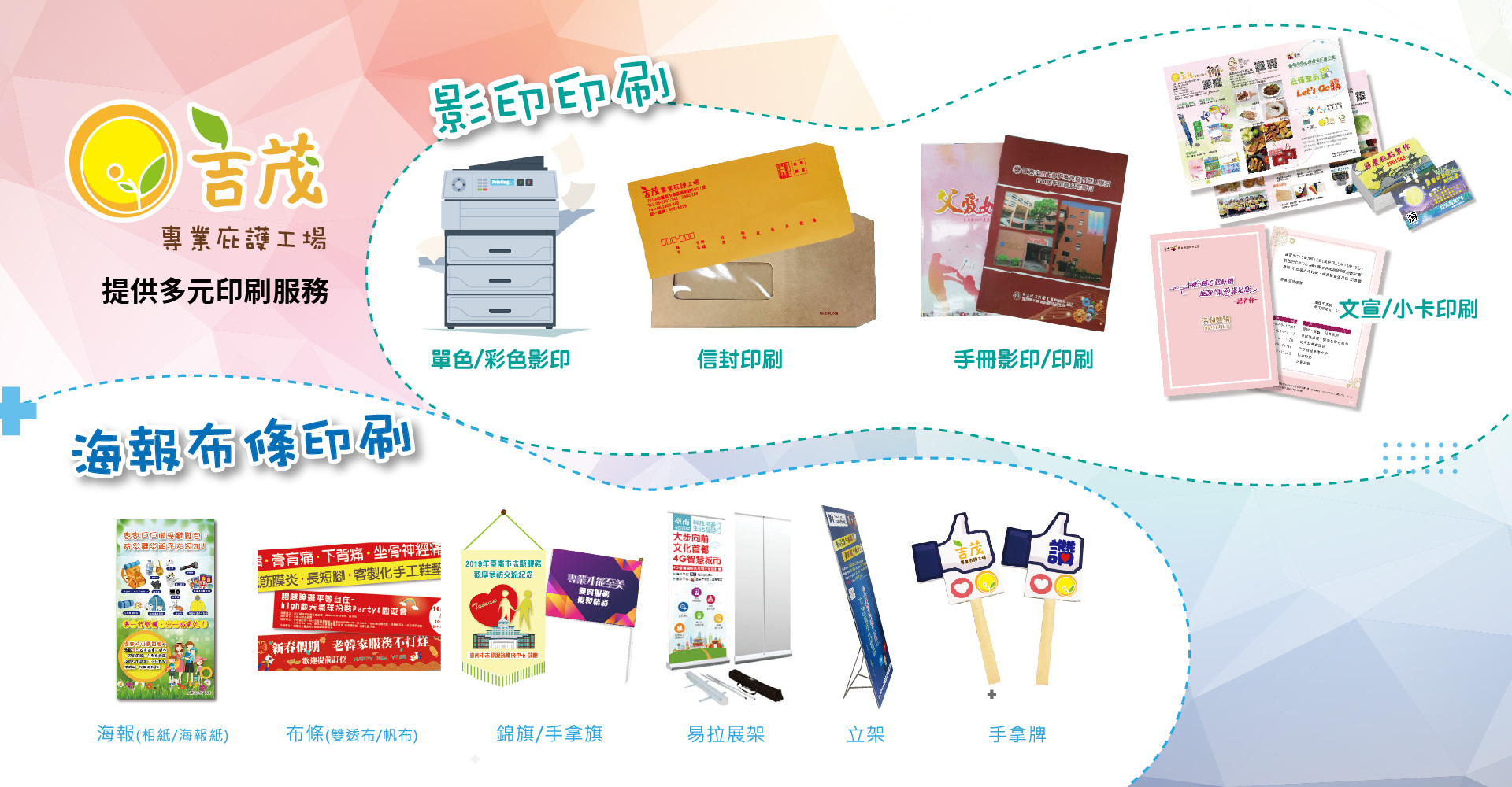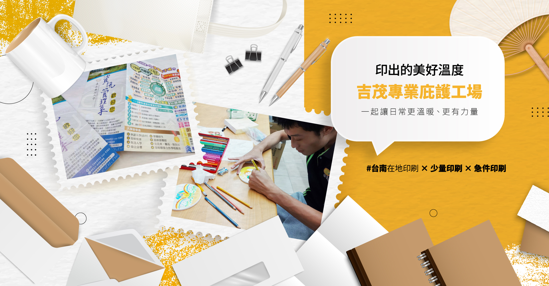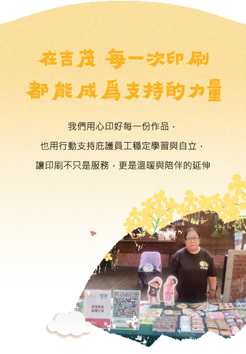 吉茂專業庇護工場,結合影印、印刷、設計與客製化商品製作,以專業品質與實惠價格服務在地居民、學生、企業與創作者。