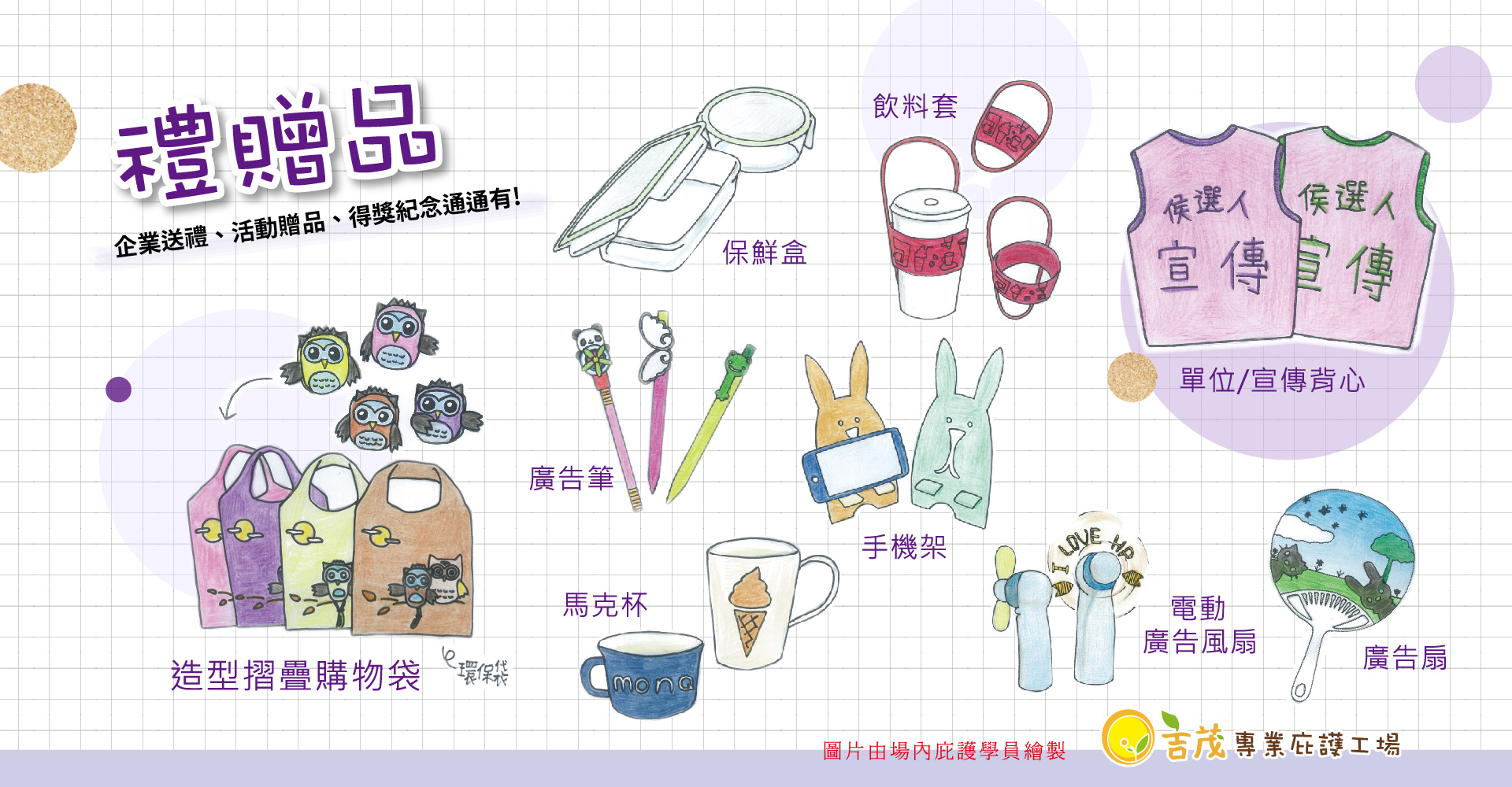 馬克杯、帆布袋、桌曆、鑰匙圈...等,讓品牌與心意延伸。